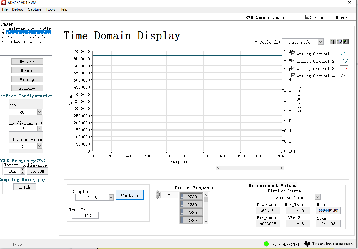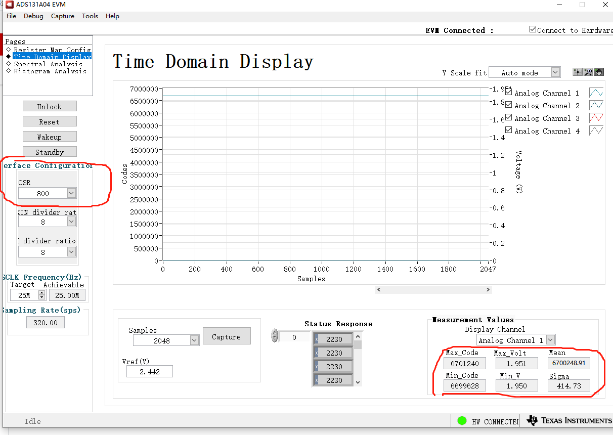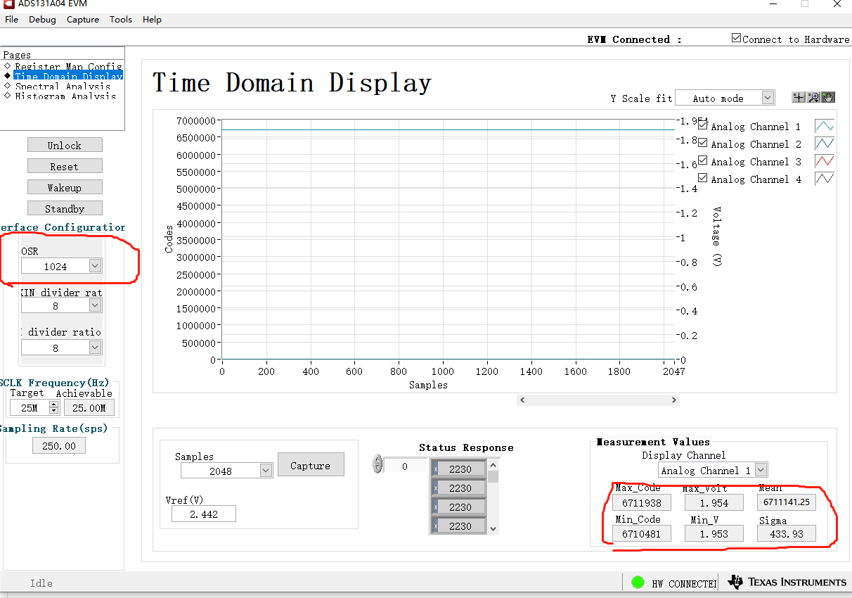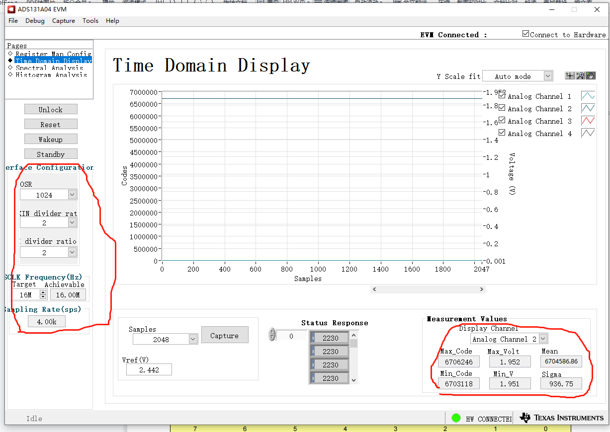 为了验证,买来了官方评估板,通过测试发现:输入电压为2V。在设置输出速率为3.096K时,即CLK2寄存器的3:0位设置为0010,采集到的电压是1.953~1.954V。如下图1