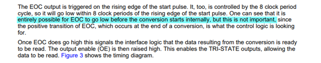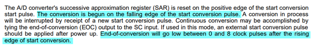 我们的START和ALE连接到一个管脚,使用STC89C52控制,ADC的时钟为28K,启动ADC转换即Star由低电平变为高电平后,EOC也立即由高电平变为低电平,TEOC的延迟时间为0us,没有出现手册上的delay时间,