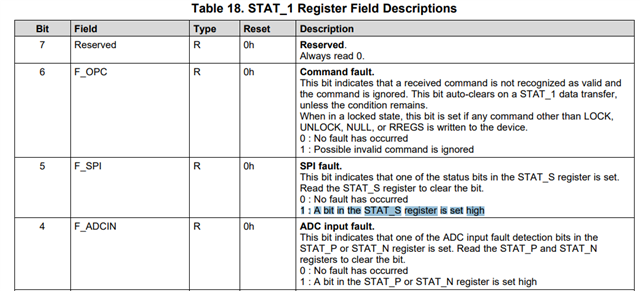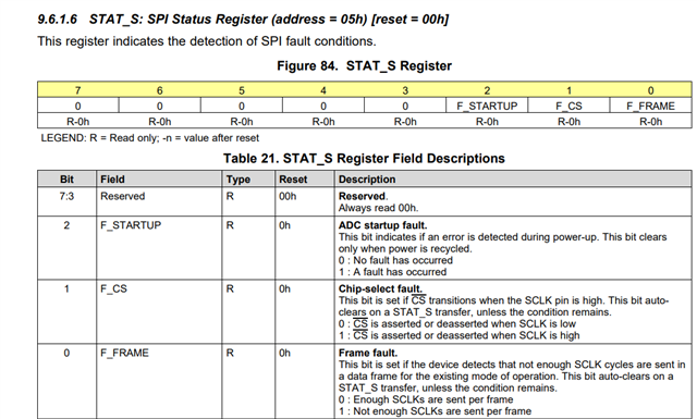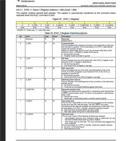 ADS131A04: 在使用过程中读取ADC数据时,芯片回复的stat_1寄存器一直是0220,是否报SPI fault,该如何处理