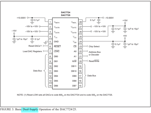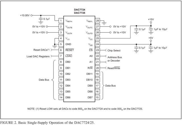 很抱歉我们没有有关28335驱动DAC7724 应用的电路和代码参考资料。您可以参照 datasheet 给出的单电源或双电源原理图接线,如下截图所示: