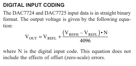 为生成波形而写入的值将取决于波形每个周期所需的点数,这是一个12bits并行接口的设备,因此值的范围从0到2^12(或0xFFF)。输出电压的计算公式如下: