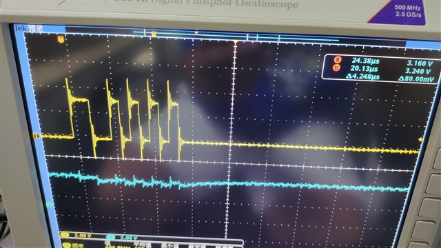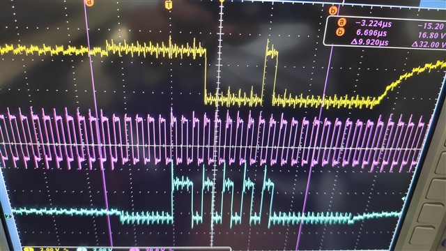 上面的图片中展示的是DIN和DOUT信号,因为测试中发现在SCLK上使用示波器会在DIN引入严重的串扰,所有没有接。但是模块的ICLK使用2M时钟,经实际测量DIN和DOUT时序上没有问题,同时我已经可以正确读取到FF04的就位信号,但是发出的指令没有返回。