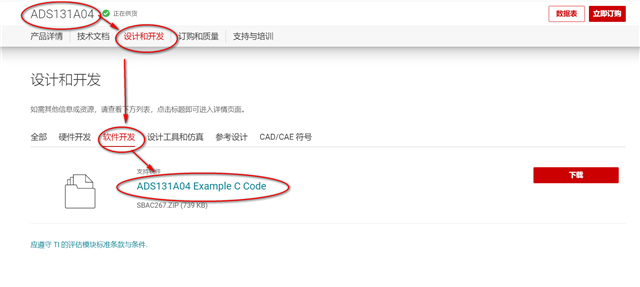 ADS131A04  产品主页如下路径提供了example code,我直接附在这里:ADS131A04 Example C Code