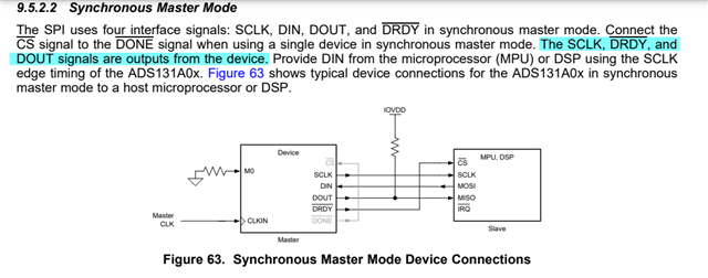 • 按照手册的说明,同步主机模式下似乎没有使用CS信号?如图63所示,我将ads模块的cs与done连接,然后单片机使用软件cs并内部持续拉低进行持续的spi通信。DRDY引脚使用另一个单独的GPIO引脚作为中断输入,但是在初始化过程中我没有使能这个中断。按照您的回复和手册的连接方式,是不是表示只有在DRDY拉低的时间内进行通信才是有效的呢?