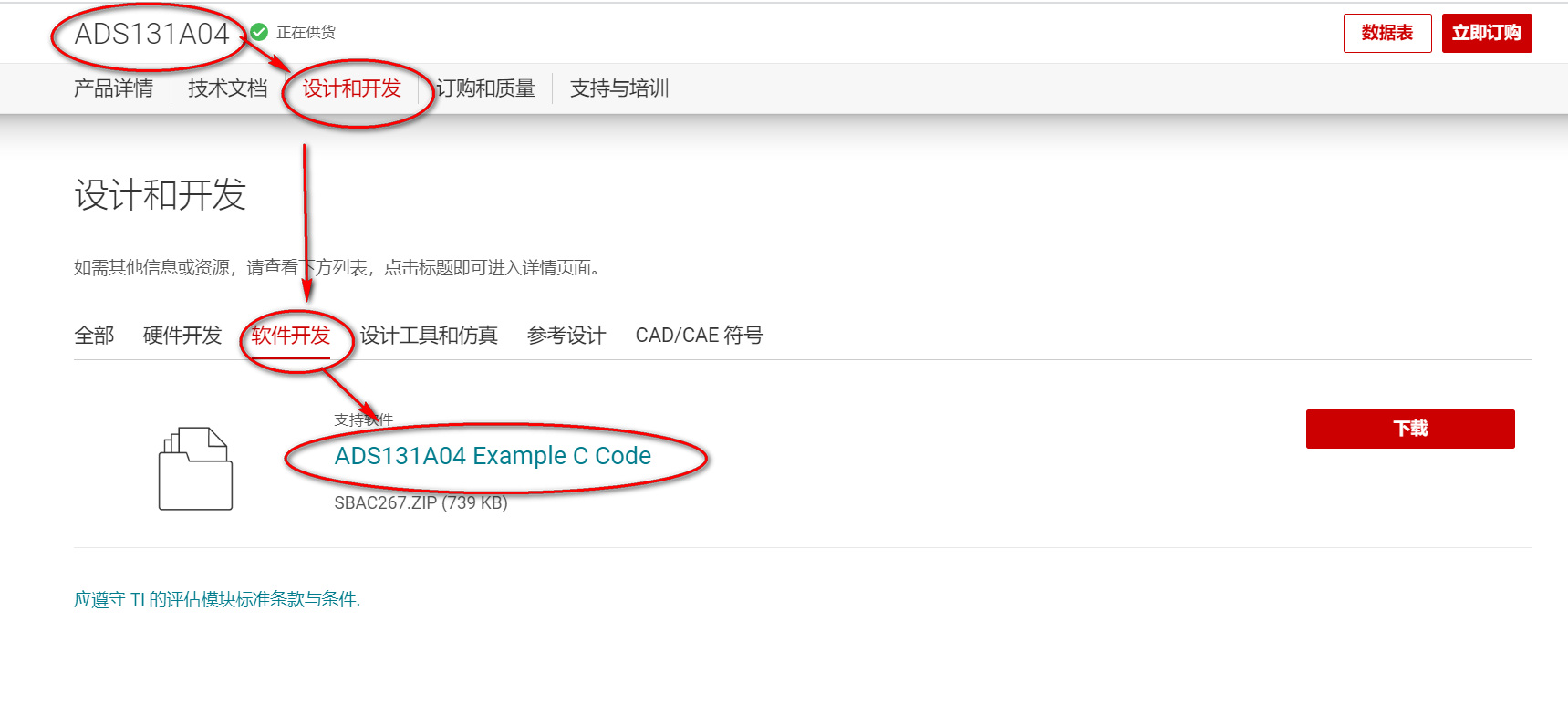 在ADS131A04 产品主页如下路径提供了example code,我直接附在这里:ADS131A04 Example C Code