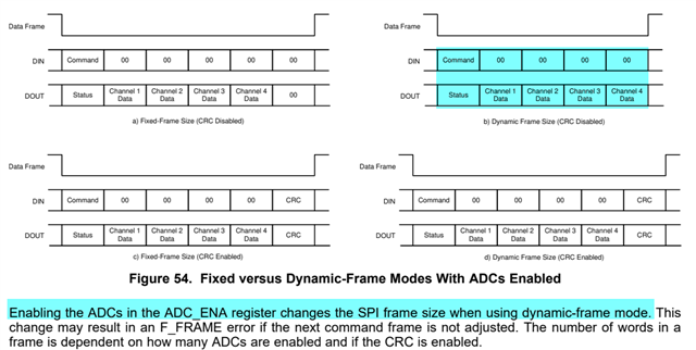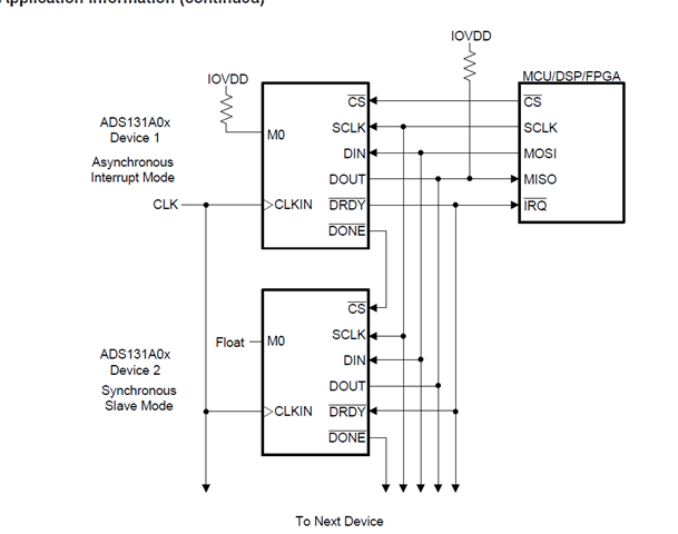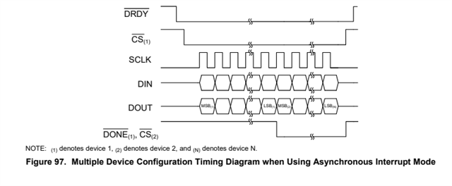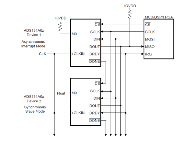 使用两片ADS131A04级联,FPGA作为主控,采用以下连接方式,时钟第一片接晶振,第二片时钟输入直接接第一片的CLKIN。抓取波形入下图,为什么发送ADCEN信号时,从片的片选信号没有生成。