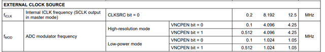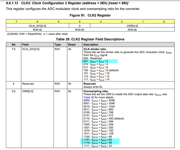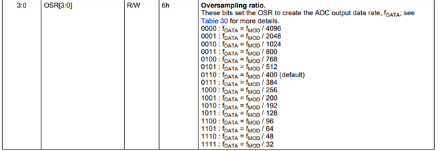 我在测试时发现将OSR设置为D/E时会出现数据位全为0的问题。我的配置是同步主机模式,M0-M2全部接地,通道1-4全部使能,不使用CRC,数据帧长度浮动,因此单个数据帧应为15个字节。目前可以达到的最大分频是CLK2=0X2C,将其设置为0X2D或0X2E时返回的数据帧为220000 000000 000000 000000 000000,即状态返回正常,但是数据位全为0。