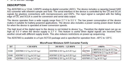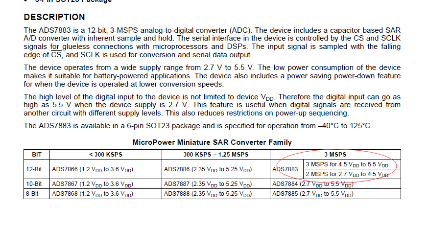 根据数据手册中的说法,2.8V-4.5V供电,数据率只能到达2MSPS,只有4.5V-5.5V供电的情况下,数据率才能达到3MSPS。