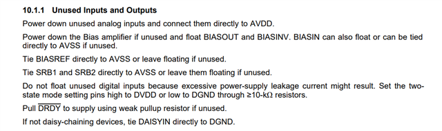 你好,请问一下ADS1299的模拟输入IN1P~IN8N,这些引脚需要加ESD静电保护吗?还有如果不使用右腿驱动,对应的那些引脚是悬空还是接到哪里呢?