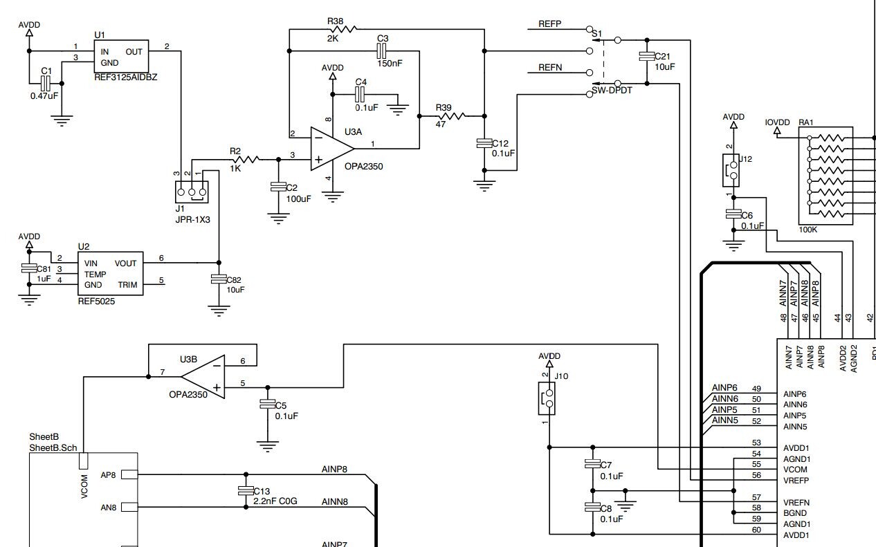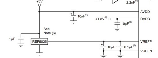 ADS1278基准电压部分采用REF5025,在ADS1278芯片手册里REF5025输出端直接接AD未采用运放如下图,在ads1278的demo板里用了运放OPA2350如下图