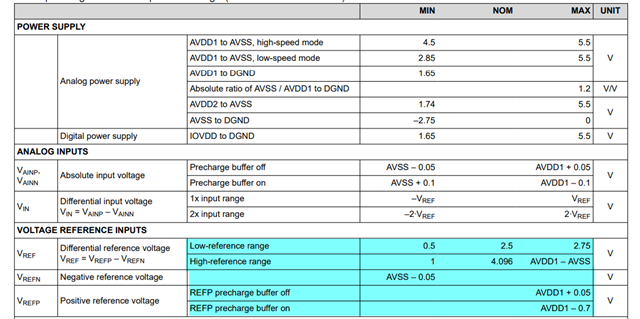 可以用5V的参考电压,如下截图所示,最大参考电压Vref 在High-reference range 是AVDD1 – AVSS差分电压,而AVDD1 – AVSS差分电压可以到5V: