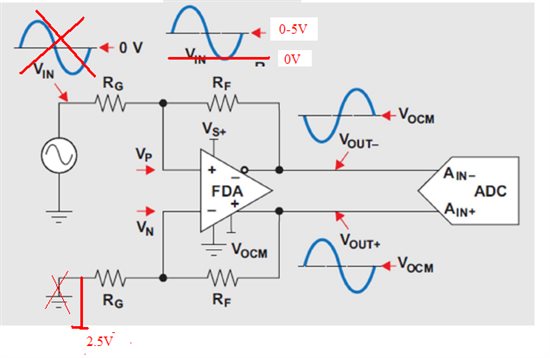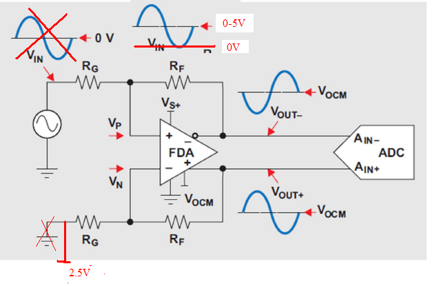 这段文字就是你加2.5V偏置的用法。"If the source swings from ground to some positive voltage, grounding RG2 gives a unipolar output differential swing from both outputs at VOCM (when the input is at ground) to one polarity of swing. Biasing RG2 to an expected midpoint for the input signal creates a differential output swing around VOCM."