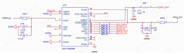当出现采集数据全为0时,您测量ADC各供电管脚、基准电压、reset pin和pdwn pin电压、以及模拟和数字地之间电压是怎样的?同时SPI CS、SCLK、DRDY是正常的吗?