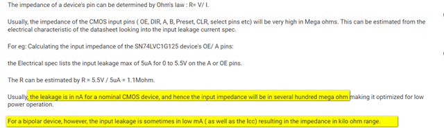 参考这篇FAQ,针对我双极型或CMOS逻辑器件的输入阻抗分析,一般来说,CMOS器件的漏电流nA级别,那么输入阻抗在Mohm级,对于双极型器件来说,漏电流为mA级别,所以输入阻抗在Kohm左右。