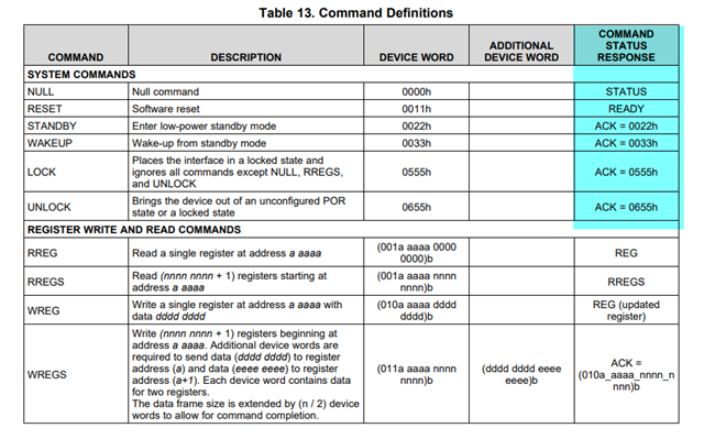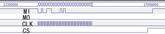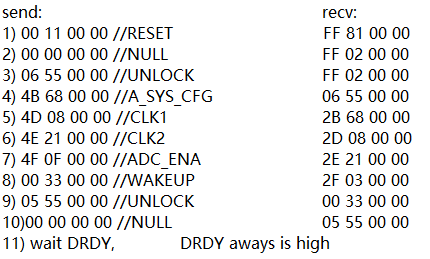 回复:经过多次测试发现,NULL 命令的响应不对是由于未发送UNLOCK命令,发送UNLOCK命令后,NULL 命令的回复为“22000000h”。同时,通过读取指令,读出地址00h到14h的寄存器值,均检查无异常。主要几个寄存器值如下:reg0=02h,reg1=05h,reg2=00h,reg5=00h,reg7=05h,reg11=68h(也设置过E8h),reg12=3Eh,reg13=08h,reg14=86h,reg15=03h。从而说明,SPI通信不存在问题。