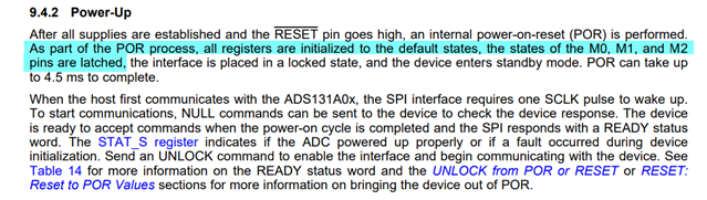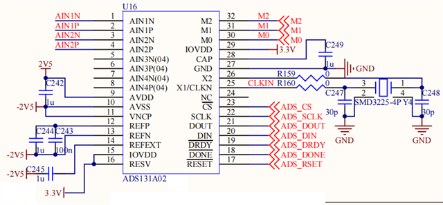 1)M2\M1\M0是通过加电后由MCU程序控制,而不是直接通过硬件进行上下拉,是否存在上电配置顺序问题,即上电后M2\M1\M0还未来得及配置,ADS131先判断为内部时钟模式导致晶振不起振,待MCU配置M2\M1\M0,也不能重新起振?