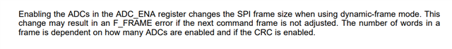 D_SYS_CFG 寄存器您采用的默认值是吗?那默认帧长是动态帧长,那么使能 ADC 后,SPI 帧长将改变,后面的命令帧长是否按使能通道数增加了?