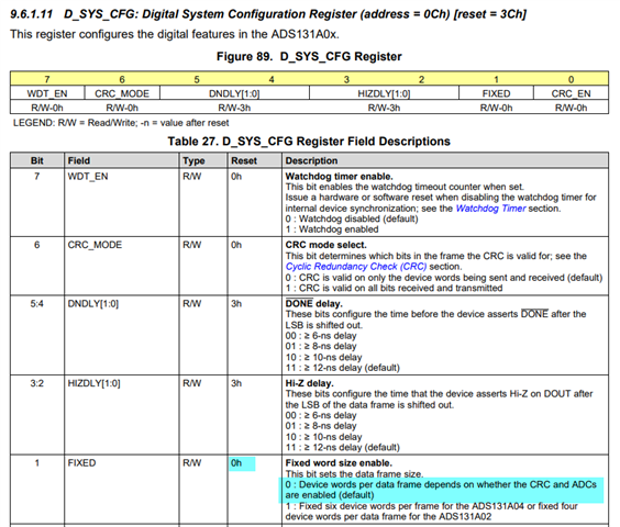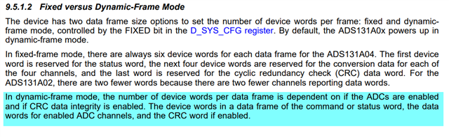 2)D_SYS_CFG 寄存器您采用的默认值是吗?那默认帧长是动态帧长,那么使能 ADC 后,SPI 帧长将改变,后面的命令帧长是否按使能通道数增加了?