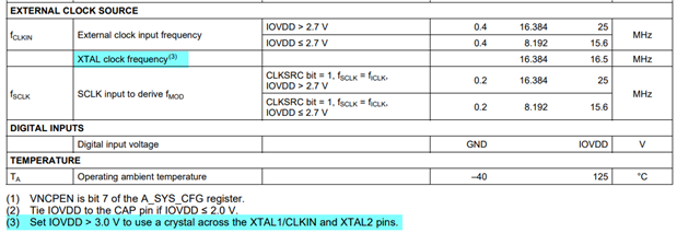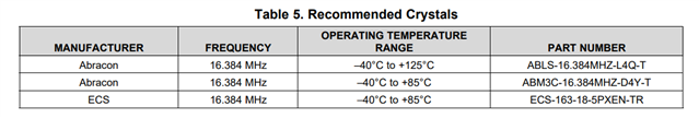 使用晶振需要IOVDD>3V,但是datasheet 没有给出最小晶振频率,你可以尝试使用16.384 MHz吗?datasheet 给出的推荐都是16.384 MHz的。