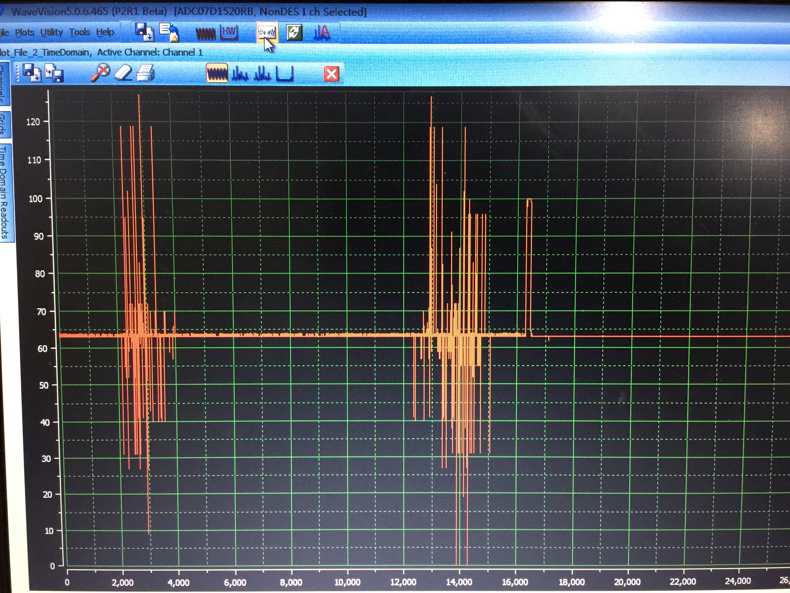 输入信号为信号发生器提供的20us间隔100ns宽的脉冲信号(200mv),输入信号交流耦合,发现输出信号有概率出现尖峰杂波(大概几百K个采样点会出现一组),而且大多数为单点杂波。信号源没有问题,用示波器看一切正常。原厂的评估板,原厂的驱动,信号源是信号发生器,不应该有问题,有没有人出现过类似情况,请教解决方法。