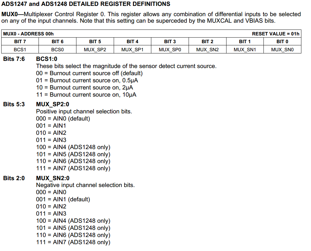 各位大神!小弟刚刚弄了一块ADS1248的芯片,现在通过这个芯片弄一个温度采集。但是我在看芯片文档的时候发现,是不是每次只能配置一对通道,比如我把AI0配成正,AI1配成负。这样组成了一组差分通道。我总共需要四组差分的通道,难道我要配置四次?而且每次配置之后ADS1248采集的数据内容是什么?有大神能给我点指导吗?谢谢了!!!