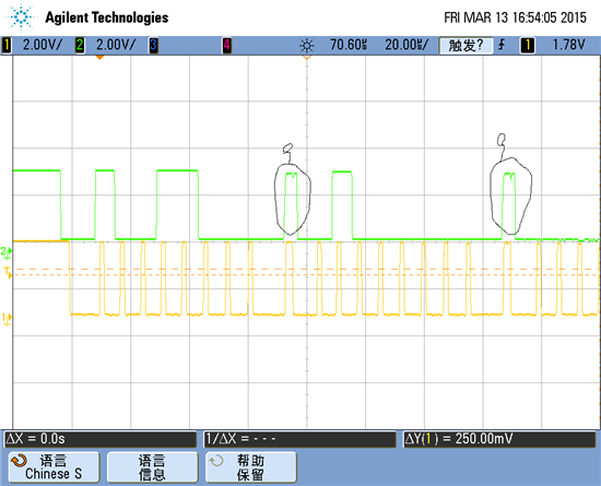 MCU使用MSP430F2618,IO模拟I2C时序,4块芯片,3个都是正常的,其中有一块在写第一个字节(AD地址)后,SDA配置为输入,然后就直接拉高了,没有ACK信号,后面都是这样的,写失败,示波器抓图如下,画9的为第9个bit,本来应该在CLK下降沿才拉高的,可是现在是SDA一配置为输入就自动拉高了: