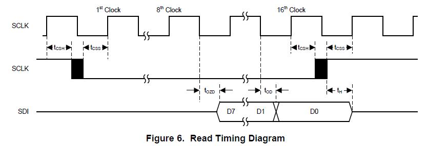 在程序中,我先写入(0x0b|0x80)意思是读指令(读取地址为0x0b寄存器的数值),并且在这之后传输一个空指令想要得到ldc1000的sdo口的值也就是地址为0x0b寄存器的数值,把这两步循环执行,用示波器观察,结果ldc1000的sdi口的波形图与写入的一致,但ldc1000的sdo口的波形图是类似于sdi口的波形,但比较乱,与期待的读到的数值0x01完全不同,不知道这是什么原因呢?