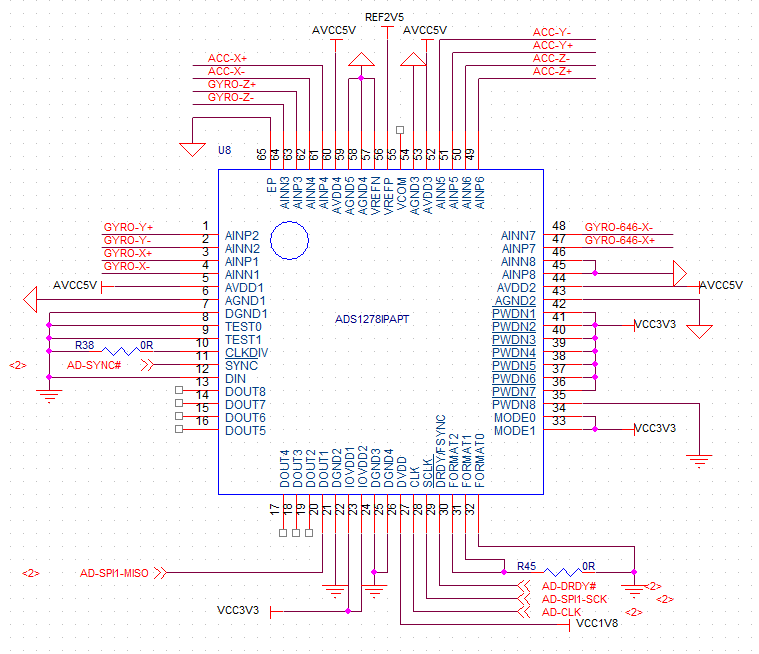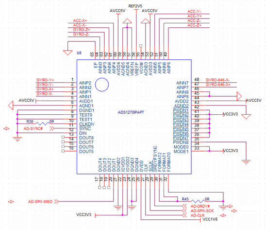 我们在使用ADS1278时,在使用过程中很奇怪的坏掉,测试DVDD1,8V的电流可达200mA左右,已经烧坏3个芯片了,请问是什么原因?以下是我们的电路,请帮助分析,谢谢!