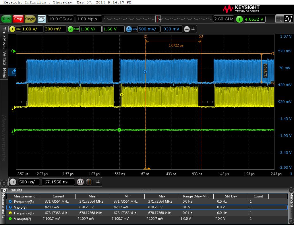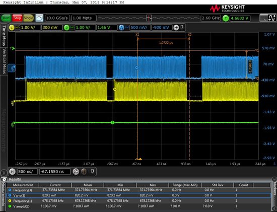 我输入的采样频率是1.6GHZ,然后用的是双通道间歇采样,1:4Dumex模式。 DCLK最后输出为400MHZ。但是DCLK不是连续的,中间会出现空白。如下图所示。