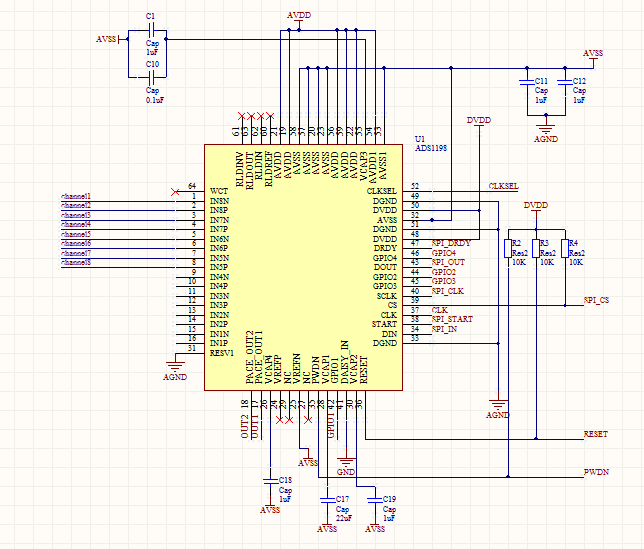 2、我自己画了一个ADS1198的原理图,由于是采集脑电信号,WCT,RLDINV,RLDOUT,RLDIN,RLDREF没接,请问这样有问题吗?打算用内部2.4V参考电压,VREFP悬空,VREFN接AVSS,请问这样可以吗?AVDD的电压可以是3.3V吗?