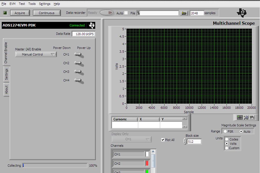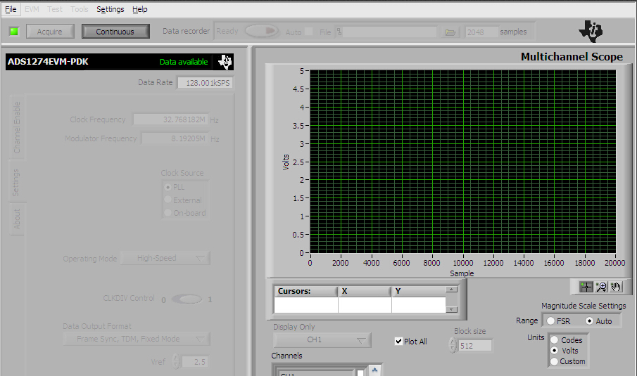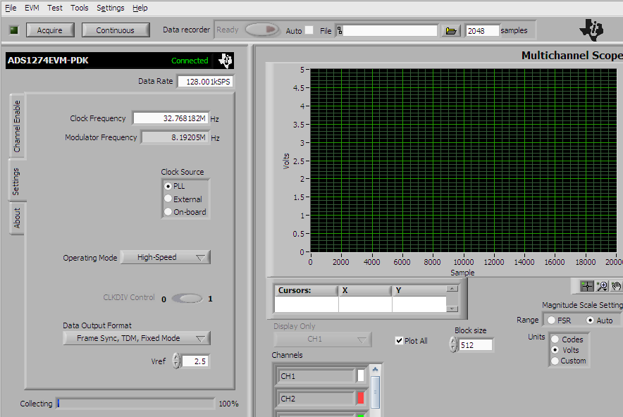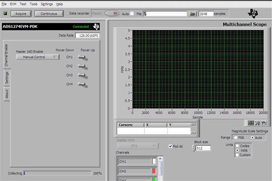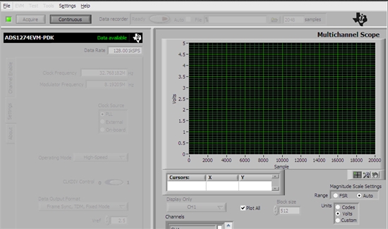 pc上ADCPro软件和ads1274evm插件已安装好,pc可以和评估板进行通信以及配置,但是无数据输出。下列图片为软件的配置以及硬件上开关盒跳线的连接。希望能得到相关工程师的解答,谢谢!