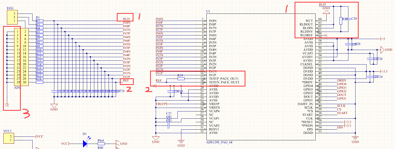 问题2:如上图中方框2,因为ADS1299引脚兼容ADS1298,方框2中TEST_PACE1/2即SRB1和SRB2,这两个脚这样接法可以吗?