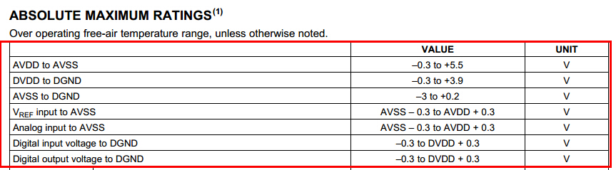 问题5:如下图,单电压供电时,每个单通道输入电压范围是(AVSS-0.3)至(AVDD+0.3)V,现在我AVDD接+5V,AVSS接AGND,是不是说我IN8N和IN8P可以最小输入电压为-0.3V(对于AGND)?