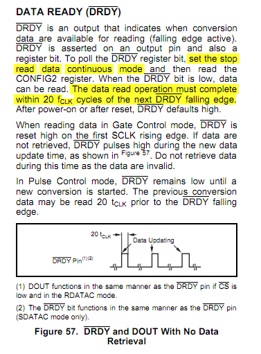 同样,在DS第28页在对DRDY信号描述中,阐述“转换好的数据必须在DRDY下降沿到来之前的20个tclk内被主设备取走”,并给出图示figure57,