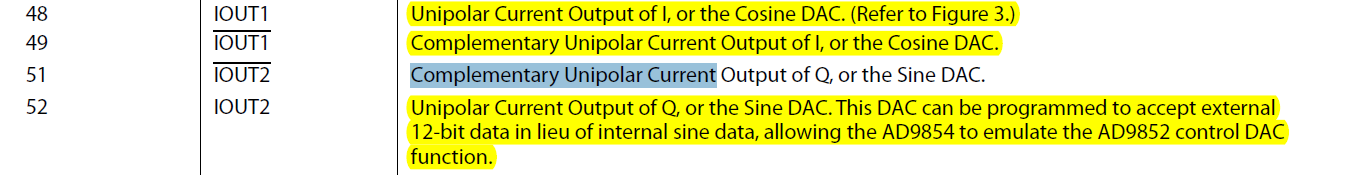 本人新手,DA芯片互补输出的概念不甚了解。现在有个DA芯片,属于电流i型输出型的,且能产生两路正交的信号,如图片所示,现在我想问的是,芯片的48脚能否独立地输出完整的余弦波信号?还是说48脚,只能输出正的半个周期的余弦波,而49脚输出负的半个周期的余弦信号,在一个周期内,这两个引脚的信号叠加,输出标准的正弦波?到底是哪种形式,求解答!