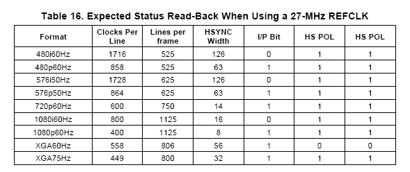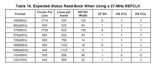 我用的正是27MHz的参考时钟。我现在疑惑的是:根据上表,如果tvp7002要输出720p60的图像,各种寄存器配置正确的话最终就是得到600x750的图像是吗?我现在给tvp7002输入720p60的分量,想得到760p60的RGB,最终得到的寄存器结果就是600x750。我不知道这是否就是tvp7002关于720p60的正确输出。