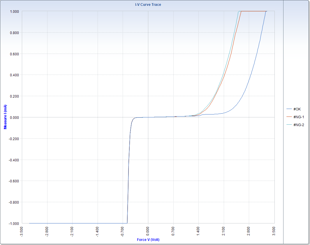 • OTDR模式下给发光命令后,芯片无出光或者出光小时间短暂。芯片在常温环境温度25°C下异常,将环境温度提高到55~65°C后芯片能恢复正常。我们对不良品进行交叉验证定位位芯片异常。找第三方检测中心测IV曲线及开盖,看到NG品AVDD PIN8-AVSS PIN4 8 异常,开盖后发现有亮点,不知道是芯片本身不良还是我们生产操作造成