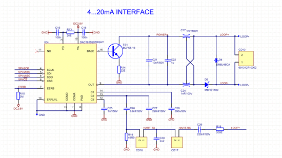 我的模块是两线制的。因此我在调试过程中烧坏了好几个DAC161S997芯片。不知道是不是因为我在调试过程中连接示波器和仿真器的原因。