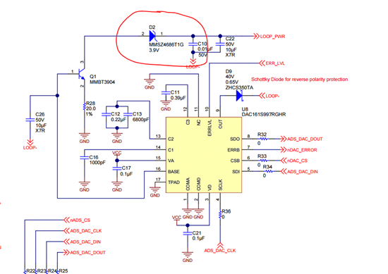 我看到TI官方的DAC161S997相关板子上都包含一个稳压管(3.9V),不知道这个器件是不是必需的。