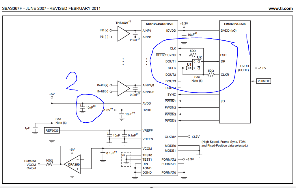 1: datasheet有解释: U1: SN74LVC1G04; U2: SN74LVC2G74. These components re-clock the ADS1274/78 data output to interface to the TMS320VC5509.