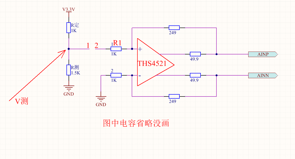 用的就是官方推荐的电路图,THS4521与ADS1274连接,用电阻分压法测电阻,电路图如图1,当把1跟2连接后“V测” 电压会变低,这该怎么办呢,是不是电阻R1的原因呢,求大神给个解决方法。。。。。怎样才能使测量阻值准确呢。。。。