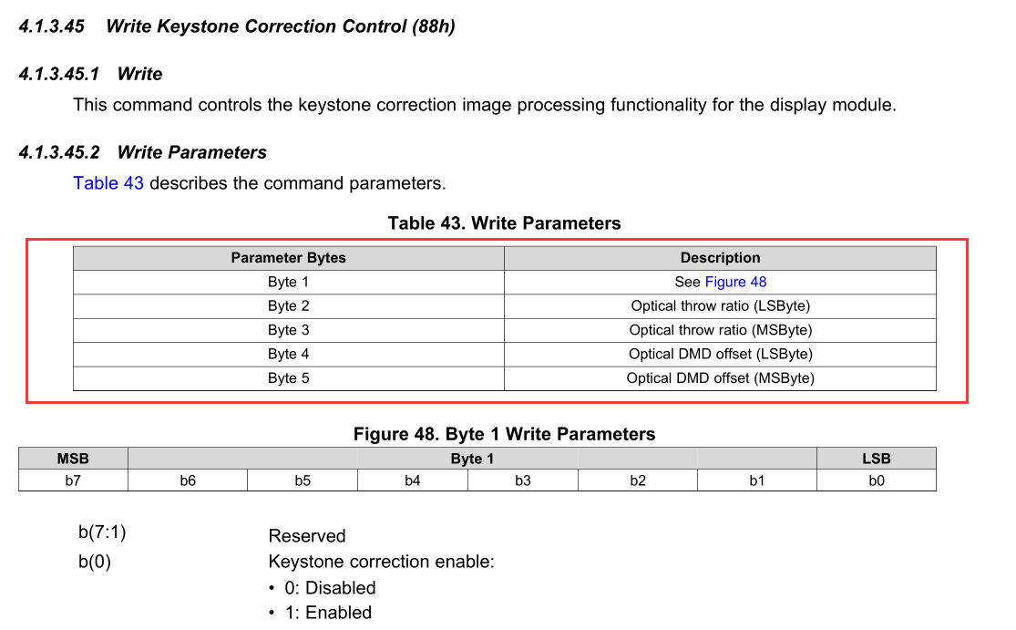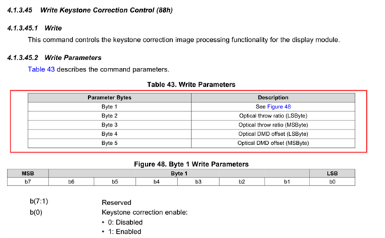 throw ratio和光学offset 这个数值我不清楚了。0xbb寄存器写的数值是16位的,控制的是pitch的,范围是0x00到0xffff 我都试过。都是可以的。输出画面也会发生变化,pitch角确实是控制成功了。0x88寄存器是控制throw ratio和光学offset,这个寄存器我读写是成功的。但是图像不会变化。写入的数据是:01 10 01 00 01 ,写入后和读取数据一致,应该是写入成功。但画面不会变化。代理商给我的说法是throw ratio和光学offset是固定参数,不能写寄存器控制,是不能控制的。可能软件手册上描述有误。