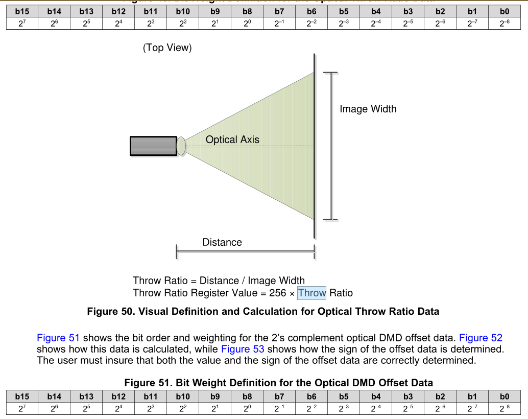 例如光机的Throw ratio为1.6,DMD offset 100%, Pitch angle为20度,所对应的寄存器值如下: