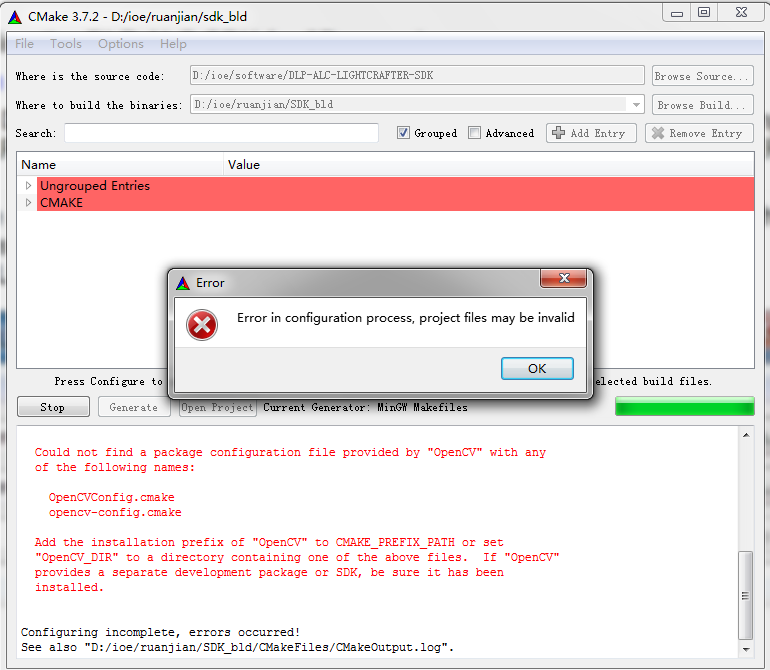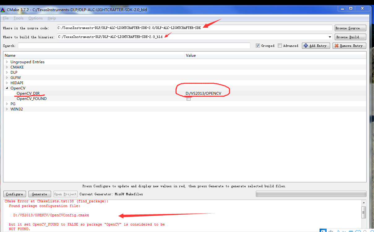 具体出现在文档第33页的步骤,出现报错后,按照文档的提示手动修改了“OpenCV_DIR”后的路径后仍然报错,如下截图所示: