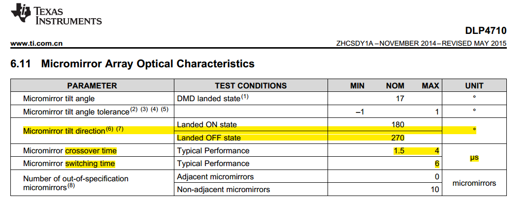 (6) When the micromirror array is landed (not parked), the tilt direction of each individual micromirror is dictated by the binary contents of the CMOS memory cell associated with each individual micromirror. A binary value of 1 results in a micromirror landing in the ON State