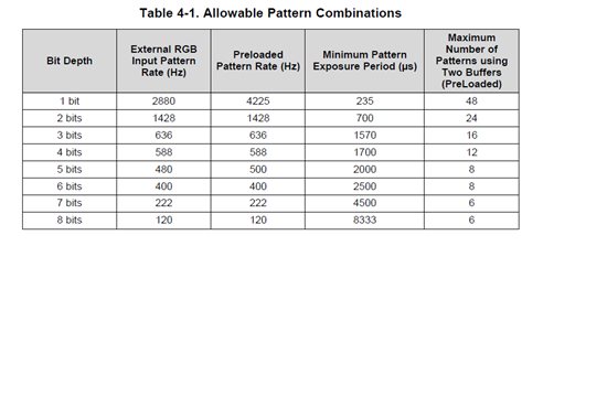 请教一个问题,如果用DLP4500做投影机,如果要投射出来RGB24的彩色图像,一秒钟能投射出来多少张RGB24的彩色图像呢?在规格说明书里面,提到的单色8bit图像的刷新率是120Hz,如何转换成RGB24的图像刷新率呢?存在一个问题,这个刷新率一方面受到像素时钟频率的限制,另一方面受到图像内存容量的限制,还与图像的额分辨率有关,有没有简单的公式来计算它们之间的数量关系呢?另外,想咨询一下,目前世面上的投影机的RGB24彩色刷新率是多少呢?