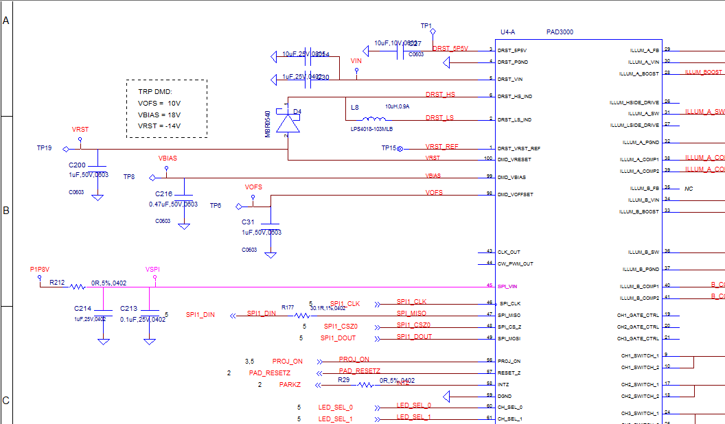 可以看下DLPA3000的INTZ脚的状态,正常应该是高电平。如果为低,电源部分有问题。DLPA3000的输入电压是多少伏?开机过程中,Vin是否稳定?另外还可以看下DLPC343x的Host_IRQ脚状态,正常为低电平。如果是高,则3438初始化失败。
