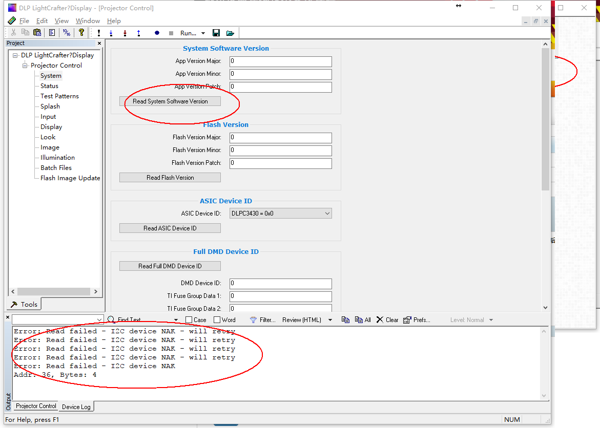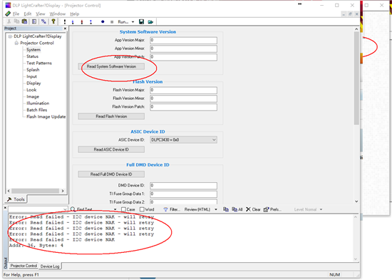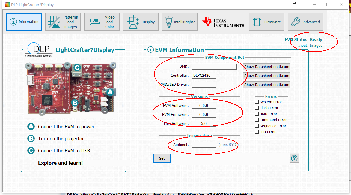 你好,我们公司新买的刚到手DLP LightCrafter Display 3010 Evaluation Module上电后,风扇开始运转,D9(MSP2)和D6(RESETZ)灯亮,switch 拨向ON后,D9(MSP2)和D6(RESETZ)D5(HOST_IRQ)和D7(PROJ_ON)亮,没有开机画面显示,GUI tool的infomation界面显示如下,