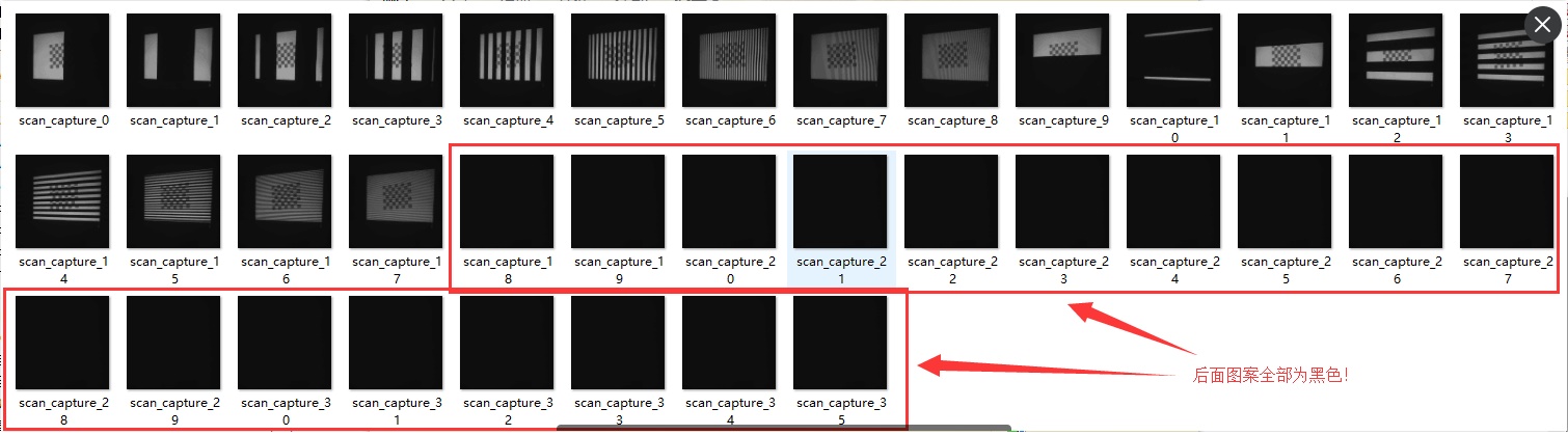 实验时,采用TI提供的DLP_LightCrafter_4500_3D_Scan_Application三维扫描方案。在先后顺利完成相机标定和系统标定后,进行三维扫描实验时,出现前面18幅图案能够正常投影与采集,而后面18幅图案不能投影(见附图),导致最后不能生成三维点云(位深度图全部为黑色)。