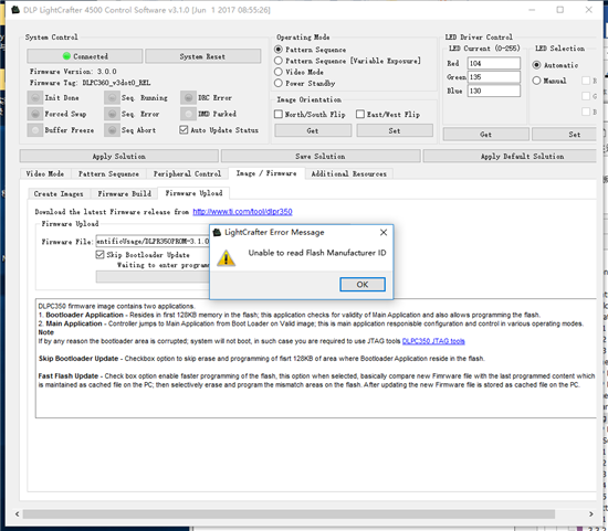 之前用的是3.0版本和更早的版本的固件和控制模块,今天看到最新版,然后用最新的固件试了试,出现了bug:上载固件时出现:unable to read flash manufacturer ID的问题,并且投影仪不再工作,通过短接J18才得以继续运行。